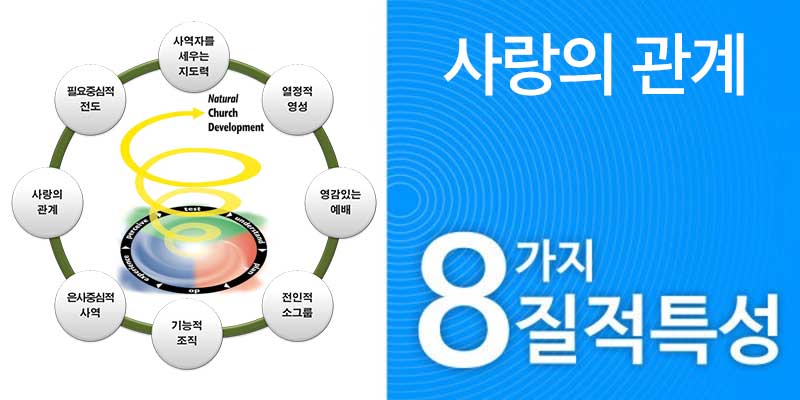 NCD는 설문지에 그리스도인들간에 얼마나 사랑의 관계가 형성되어 있는지를 알 수 있도록 고안된 일단의 질문들을 포함시켰습니다. 예를 들면, 우리는 교인들이 교회가 주최하는 공식적인 일들 이외에 밖에서 서로 얼마나 자주 만나는가를 물었습니다. 얼마나 자주 식사하거나 차를 마시기 위해 서로를 초대하는가? 교회가 칭찬하는데 얼마나 너그러운가?